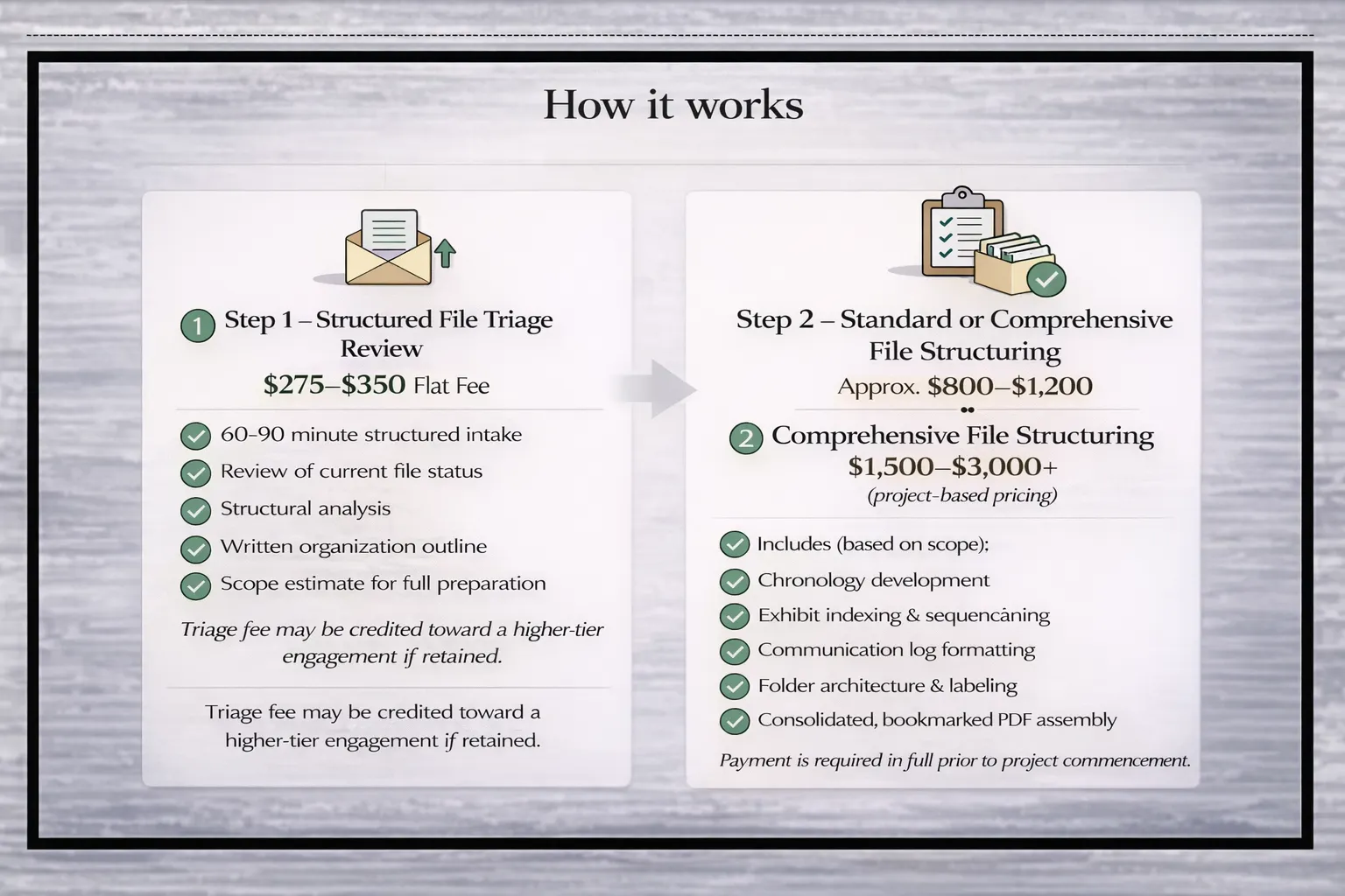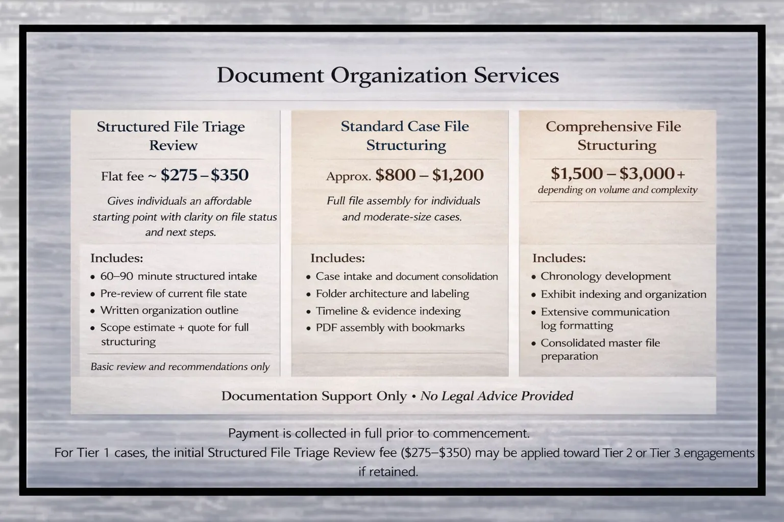 The Structured File Triage Review fee ($275–$350) may be credited toward a Standard or Comprehensive File Structuring engagement if retained.
