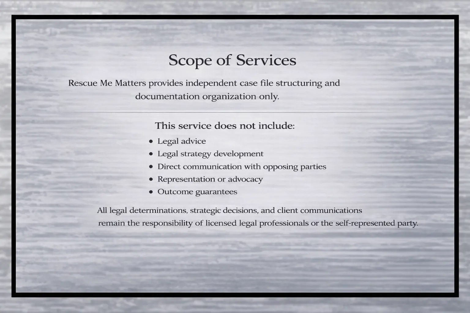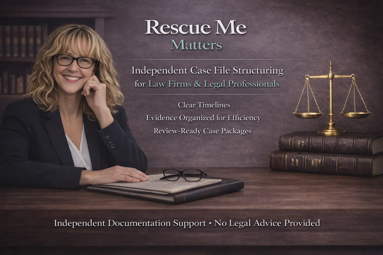 Rescue Me Matters provides independent case file structuring for law firms and legal professionals.