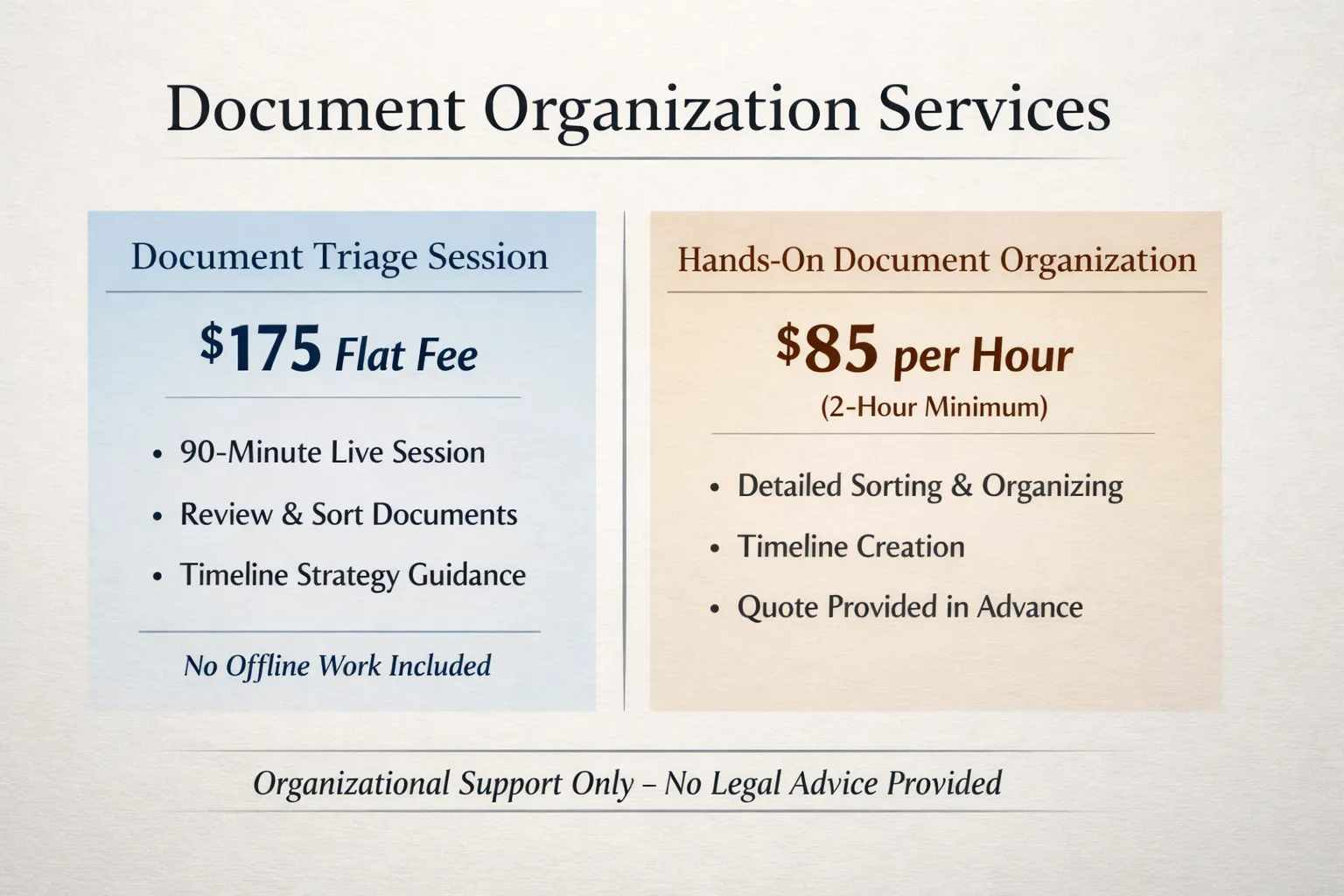 I help people organize documents, timelines, and communications so their situation is clear, usable, and ready for next steps.