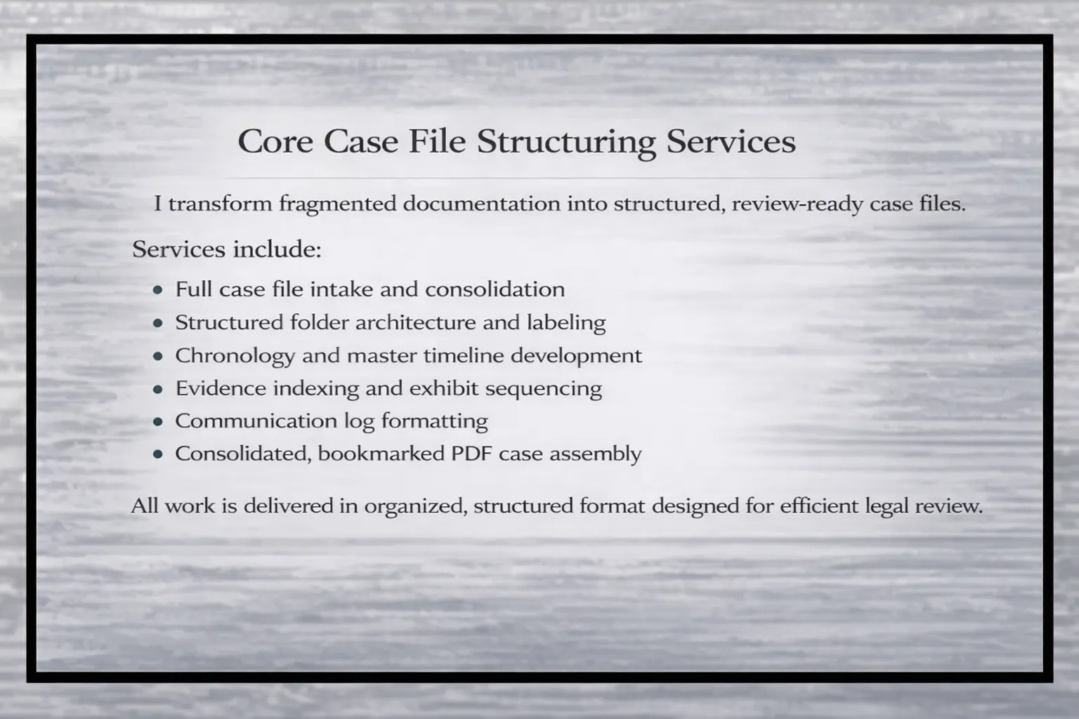 When files arrive disorganized, incomplete, or overwhelming, I bring order, clarity, and structure — so legal teams can focus on strategy, not sorting.