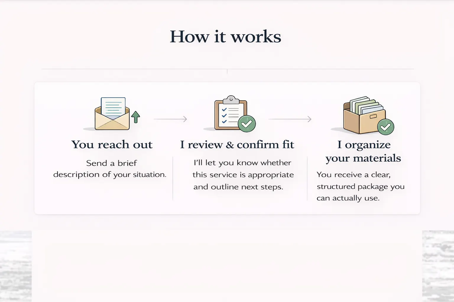 I organize your materials → You receive a clear, structured package you can actually use..